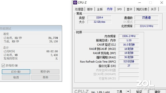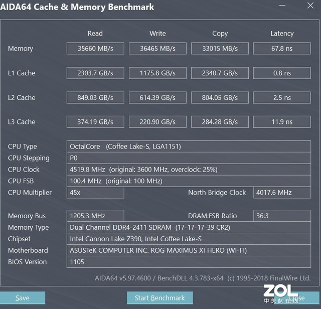 从测试的结果来看的,内存频率的提升,对于性能的影响还是非常大,在2400MHz时,内存的读取,写入,复制速度分别为35660MB/s,36465MB/s和33015MB/s,延迟为67.8ns。