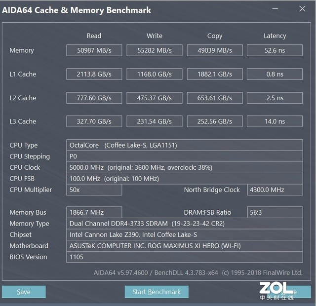 当在3733MHz频率下时内存的读取,写入,复制速度分别为50987MB/s,55282MB/s和49039MB/s,延迟为52.6ns,性能相比提升将近达到了40%,可以说是相当明显了。
