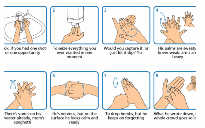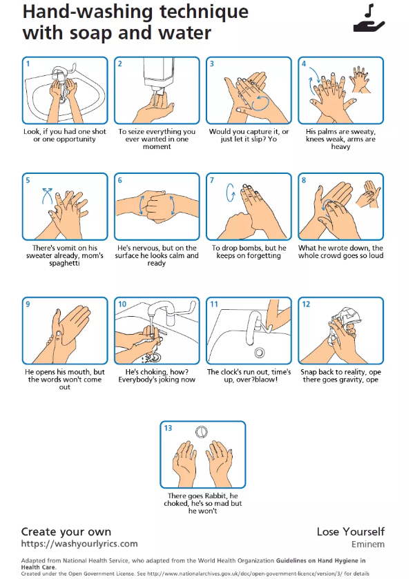 该工具很简单但有效,由英国开发人员(Twitter用户名William)创建。只需输入歌曲名称和歌手名称,它就会自动从Genius中提取相关歌词,并将它们逐行放置在英国国家卫生局(NHS)制作的信息图上。