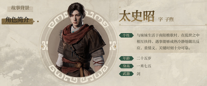 个性:与妹妹生活与南阳樵歌村,在乱世之中相互扶持。遇事能够成熟冷静地做出反应,重情义,关键时刻十分可靠。