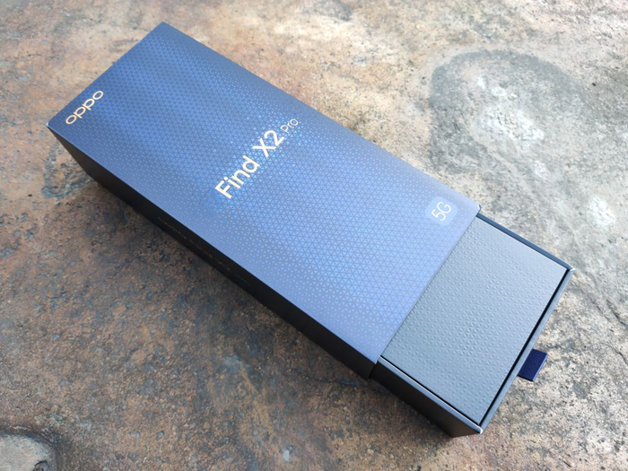有别于OPPO其他系列的白色盒子,Find X2 Pro包装盒延续Find系列的深色系包装。它采用的是渐变藏蓝色+金色字体的撞色设计,而且采用三角图案背景,盒子做工精致,采用抽拉设计,摸上去有种皮革的触感,整体诠释了Find系列的高端定位。而且在包装的右下角明确标识“5G”,表明这款手机支持5G网络。