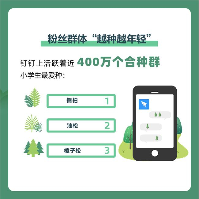 线上植树的兴起,带动了更多年轻人参与的热情,“粉丝群体”正在从“大学生”发展到“小学生”。目前已有超过 2500 万在校大学生在蚂蚁森林里种树,全国 28 个省的 300 多所高校拥有自己的高校公益林;此外,钉钉上还活跃着近 400 万个“合种群”,小学生们的“班级树”最爱选种侧柏、油松和樟子松。