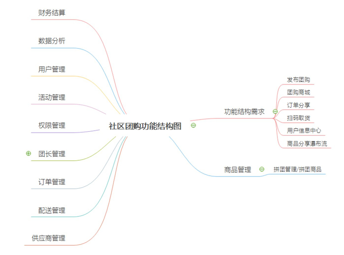 相对简单的做了下社区团购的产品的功能结构图,并不复杂。采购-仓库-出库-分拣-出库-配送。