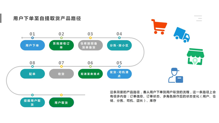用户下单——系统接收订单——仓库按照备货单配货——分拣根据小区进行配货——出库司机清点(箱数)——发货成功——配送至自提点——提醒用户上门自提