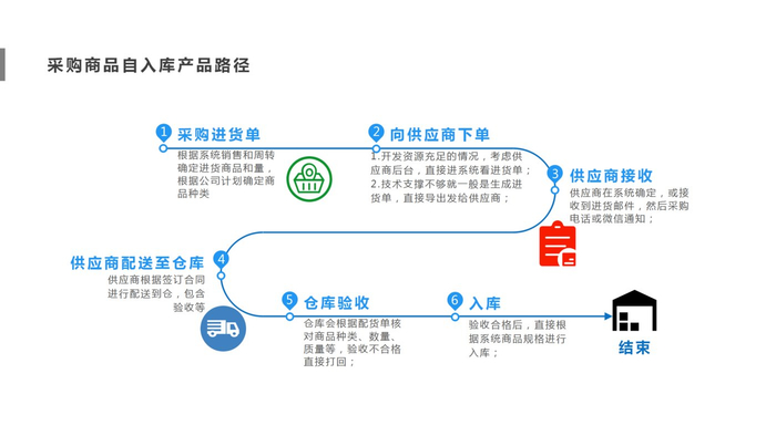 采购根据系统商品销售/周转确定进货单——向供应商下单——供应商接收——配送至仓库——仓库验收——入库