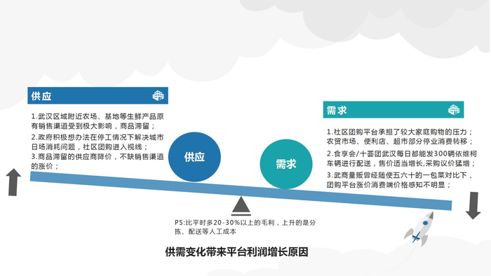 其实,受到新非典型冠状肺炎影响,供给需求端的变化,部分基地和供应商的生鲜肉蛋快消产品没有地方去销售,必然会造成平台采购价大幅降低;由于武商量贩曾经50~60/包菜的对比下,消费者价格不明感,并且愿意接受;还有感谢社区团购平台,让我能吃上菜、米饭、包子等。