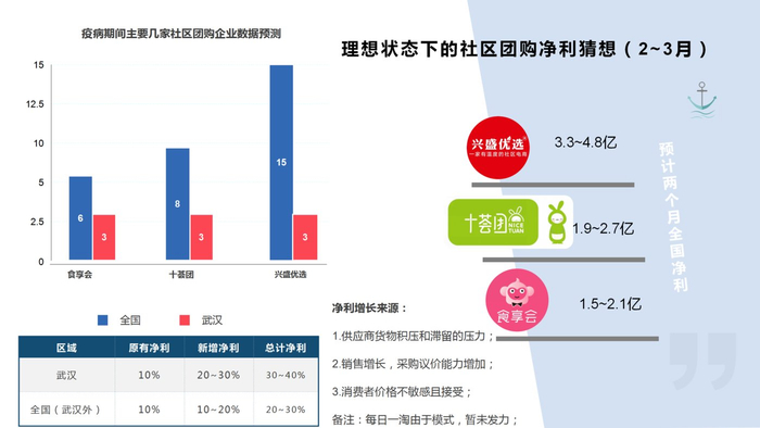 期新增10~20%净利;根据网上可查询销售数据,估算全国其他地区交易额估计食享会全国6亿/月,十荟团8亿很可能,由于并无武汉那么稀缺,新增净利10~20%。因此2-3月两个月,暴力输血,每日一淘模式,两个月内交易受到较大影响。