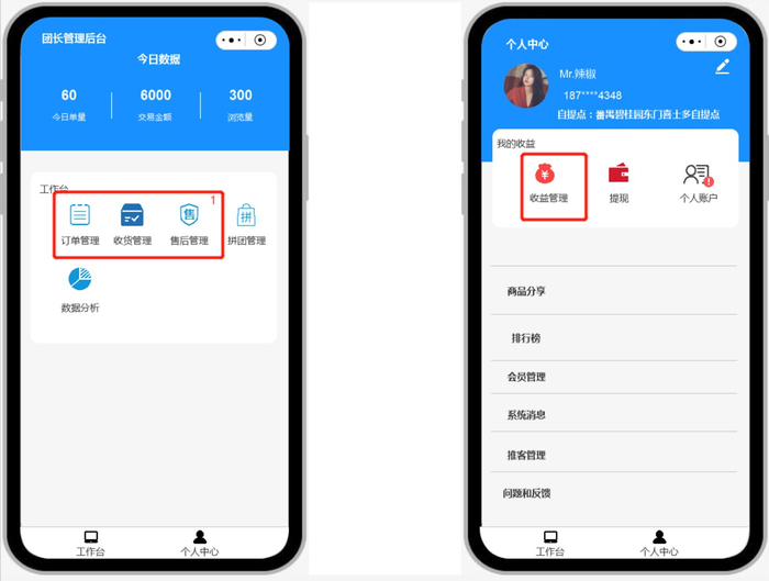 这里功能最核心的就是订单管理、收货管理和收益管理;
