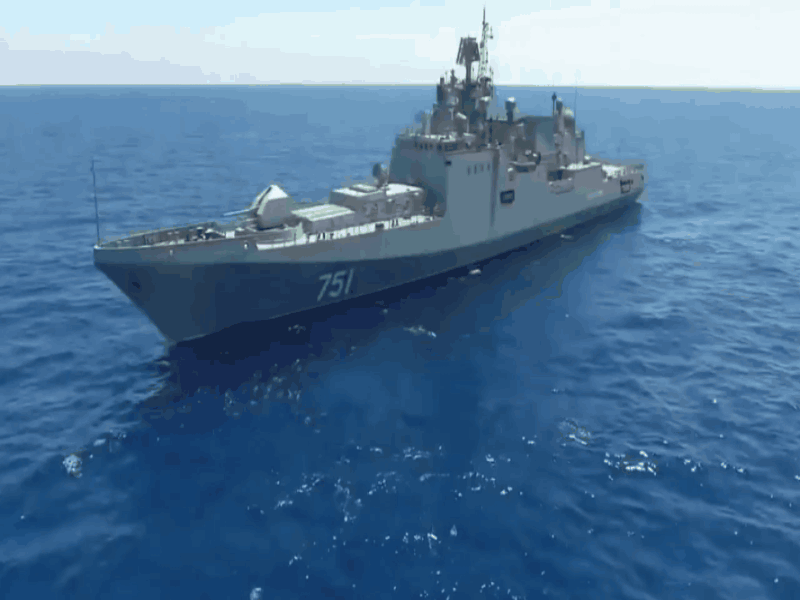 目标区内,俄海军“马卡洛夫海军上将”号(舷号799)隐身护卫舰严阵以待。该舰为格里格罗维奇海军上将级(11356P/M型,又称克里瓦克IV型)3号舰,于2017年12月投入黑海舰队服役。