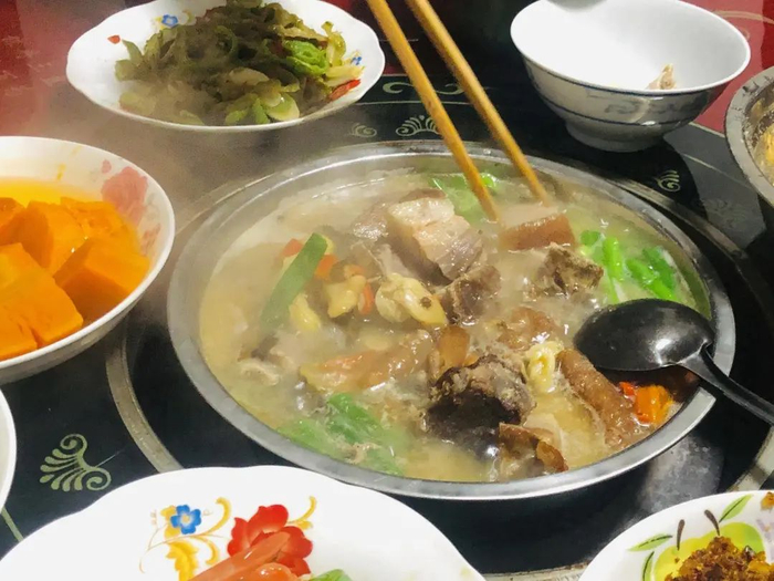 幺姑家里的饭桌,是这边村里家家户户都有的圆形火炉,火炉圆桌的中间用来炖菜烧水,旁边一圈则绕着放菜,一般都是一些幺姑的家常菜:炕土豆,炒猪头肉,白菜心,玉米粒,小葱煎鸡蛋等等。旺火将腊蹄子火锅,炖得香气四溢,火锅汤上鼓出一个个“小温泉”,在莲藕和猪蹄堆成的嵩山峻岭下冒着泡。锅里的肉已被炖得烂熟,最好吃的大约是那种连皮带筋炖得松散而又彼此牵扯着的肉。夹一块到碗里吹吹放进嘴里,肉的油腻早已在各个工序下消解,只剩下腊肉的香味和软糯的口感。