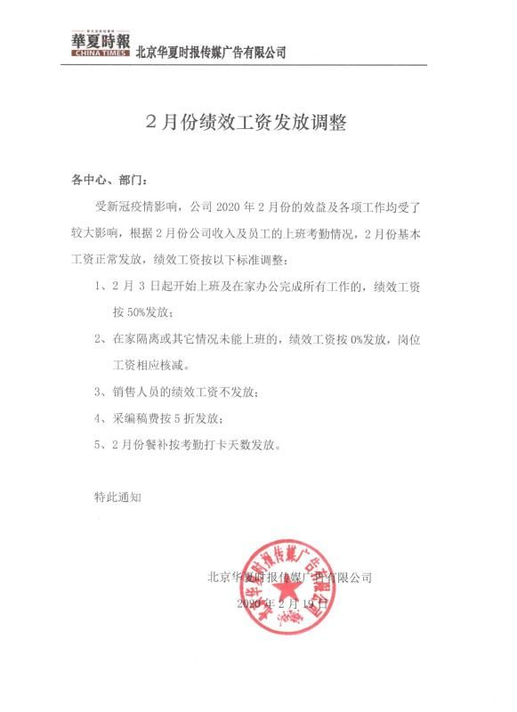 《华夏时报》则被曝发表了一则《2月份绩效工资发放调整》的公告,称2月3日起在家办公完成所有工作的,绩效工资按50%发放,采编稿费按5折发放。