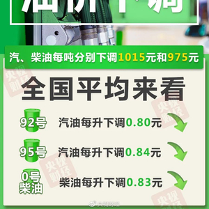 全国平均来看,92号汽油每升下调0.80元,95号汽油每升下调0.84元,0号柴油每升下调0.83元。