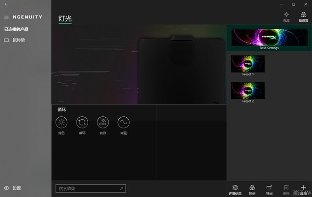 HyperX NGENUITY驱动界面此外,我们还可以更改灯光的循环方式,包括纯色、循环、波浪、呼吸四种类型。笔者比较喜欢呼吸灯的效果,非常的炫酷。