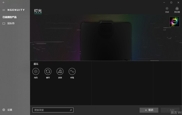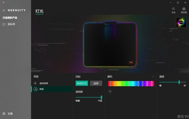HyperX NGENUITY驱动界面在HyperX NGENUITY驱动设置界面可以对鼠标垫的RGB光效进行设制置,我们可以随意的更改灯光的颜色,还可以更改灯光的速度。如果想关闭灯光也可也在这个界面内实现。