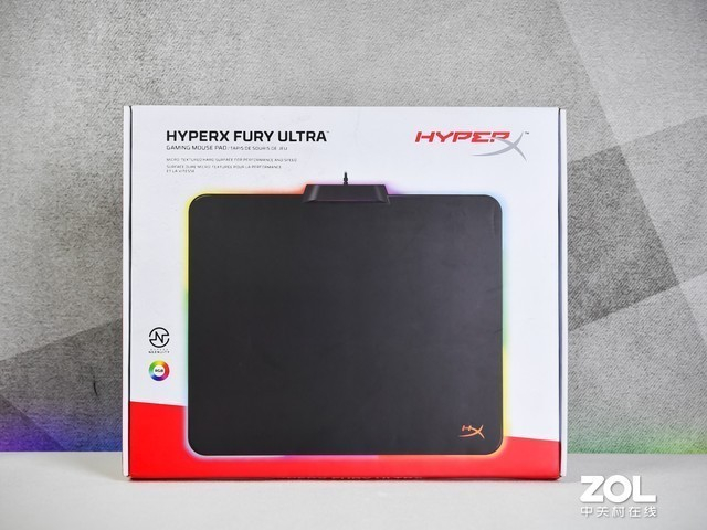 HyperX FURY Ultra复仇女神终极版RGB游戏鼠标垫包装正面HyperX FURY Ultra复仇女神终极版RGB游戏鼠标垫是HyperX发布的360°RGB灯效鼠标垫,从外包装能够清晰的看到鼠标垫带有灯效,可见这是HyperX FURY Ultra复仇女神终极版RGB游戏鼠标垫的主要卖点之一。