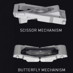 先来看下两种键盘的差别。如图所示,上面的就是剪刀式键盘,其X结构看起来像个剪刀,因故得名。同理,下面的蝶式键盘,则是因为V字形结构看起来像只蝴蝶。