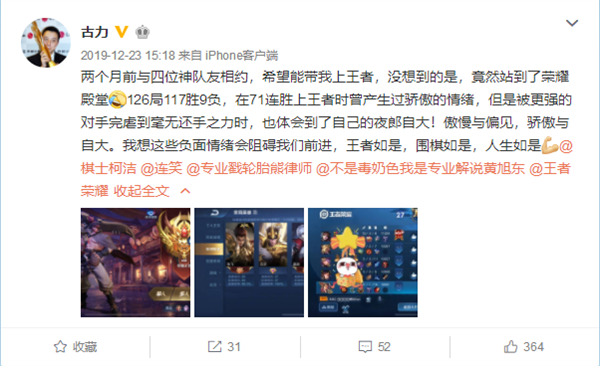 不过学霸总是全面开花,去年底,柯洁就和好友古力开启过王者排位赛,126局117胜9负,而且实现了71连胜上王者。