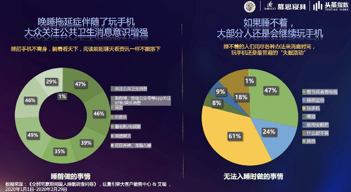 根据白皮书的数据分析,全民宅家前,90%的人在晚上8点到12点间就寝;宅家期间,零点以后就寝的人超过50%。偷走大部分人睡眠的是什么?很显然,手机这款功效极好的“失眠神器”让人们在深夜阅读的兴趣逐渐加强。又因为这段时间长期在家里宅着,大家也逐渐失去了早起的动力。