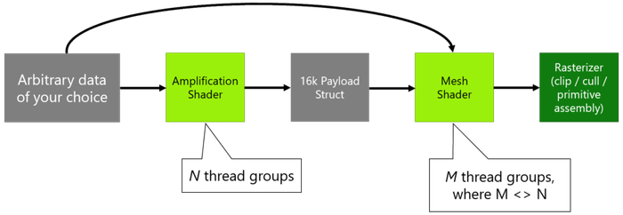 与Mesh着色器一同出现的还有一个可选的放大着色器(Amplification Shader)阶段,它运行在Mesh着色器之前,计算得到需要多少个Mesh着色器,并启动他们。