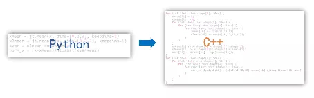 使用 Jittor 内置的元算子编译器,用户可以直接将通过元算子编写的 Python 代码动态编译成更高效的 C++ 代码。
