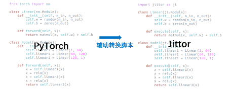 使用辅助转换脚本,PyTorch 代码可以直接转换成 Jittor 模型。在参数保存和数据传输上,Jittor使用和 PyTorch 一样的 Numpy+pickle 协议,二者的模型可以相互加载和调用。