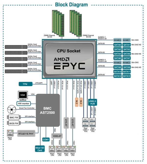 不过它是一块单路板子,仅支持一颗AMD霄龙,最高热设计功耗225W。