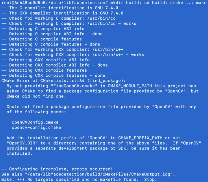 该项目编译需要 OpenCV,如果缺少 OpenCV 在使用 cmake 生成 makefile 时会报如下错误: