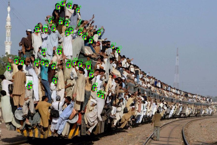 下面我们提高一下难度,使用一张开挂民族的图片测试一下效果。它也几乎把所有火车头上正面的面孔都识别出来了,火车车身上的人像没有识别出来,可能是因为那些人像实在是太小太密集的缘故。