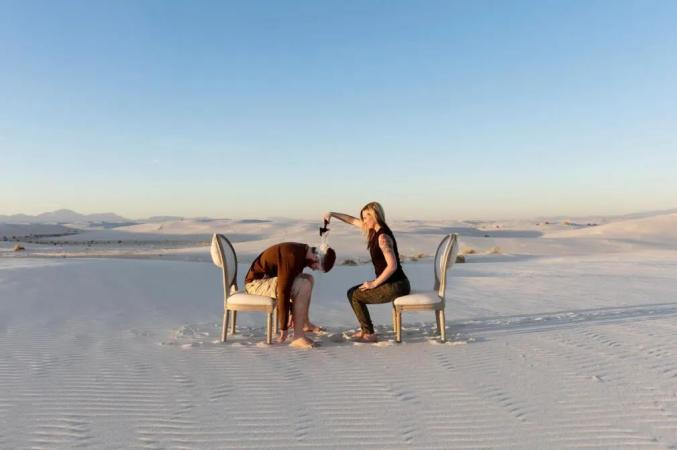 从正门进入“粮仓”,右侧是一排平房,这里便是“活山”系列群展的展览现场,它由佩内洛普·乌姆布里科(Penelope Umbrico)的《山脉》、艾比·海普纳(Abbey Hepner)的《联想对象》、艾丽丝·Q·哈格雷夫(Alice Q Hargrave)、贝丝·东(Beth Dow)的《动态山脉》、李真(Jin Lee)的《某时某地》和米利·蒂布斯(Millee Tibbs)的《山系模拟》六个展览构成,通过不同的方式和维度探讨了人们对于“山体”景观的重新观看以及人与自然环境、人与人之间的相互关系。在《山脉》系列作品中,乌姆布里科在她的苹果手机上下载了数百个相机应用程序来重新拍摄一些摄影大师的山脉作品,并使用相机应用程序中的多种滤镜进行后期处理——在这个过程中,山脉这个大自然界最古老的地标和人们精神寄托的对象,突然变得充满了不稳定性,不断移动且没有重力;在《动态山脉》系列作品中,贝丝·东拍摄了南达科他州荒地的山脉,并利用数码技术建构了大型的装置,她使用分色印刷、三维立体图、负反转和雕塑等元素,挑战了人们对于图像的既有感知,让人们重新审视图像中的科学的“真实性”概念;而在《联想对象》系列作品中,海普纳通过一系列仪式感很强的景观人像照片,来探讨人与人,人与景观之间的相互关系,“并强调了人总是存在的,不管是在镜头后面还是前面。”作为今年“唯二”的群展,“活山”表现的也许并不是我们常规意义上的具体之物,而是每个人心中的规则和执念。