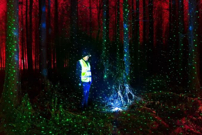 “活山”展览现场的前面是一座二层的建筑,从正门进入,一面绿色的巨大前言墙迎面而来,这里便是“主题展”的具体的展览所在。绕过绿墙,第一个展览便是亚历克斯·哈尼曼(Alex Hanimann)的《落入圈套》系列作品,他搜集了许多由夜间自动感应功能相机所拍摄的动物照片,并重新进行整理与编辑。这些原本被用来科研调查的“偶然性”照片被哈尼曼带入到“艺术的语境”的观看之中,从而让观者产生了无限的遐想——“微小的故事、戏剧性的事件、真切的情感和美丽”。这种自动感应相机的拍摄,从影像产生的意义上讲,它具有一种人为的偶然性,在作者的作品阐释中也强调了这一点——“矛盾的是,原意为了控制的监测系统引发了一种不受控制的、无意识的行为,并产生了不可预测的图像。”并且,他还强调这种拍摄行为其实是一种监视和入侵——“我们不禁自问:谁又在观看着我们?我们有危险吗?如何逃脱?面对画面,我们意识到自己也正被困在无处不在的数字监控网络中。”在《落入圈套》展览之后,便是塞巴·库尔蒂斯(Seba Kurtis)的《移居档案》系列作品,库尔蒂斯利用长时间曝光、海水浸泡胶卷和照片上“绘画”等方式来展现了当下的非法移民问题——人们背井离乡,历经磨难,以期望自己和家人可以获得一个合适的生存环境。