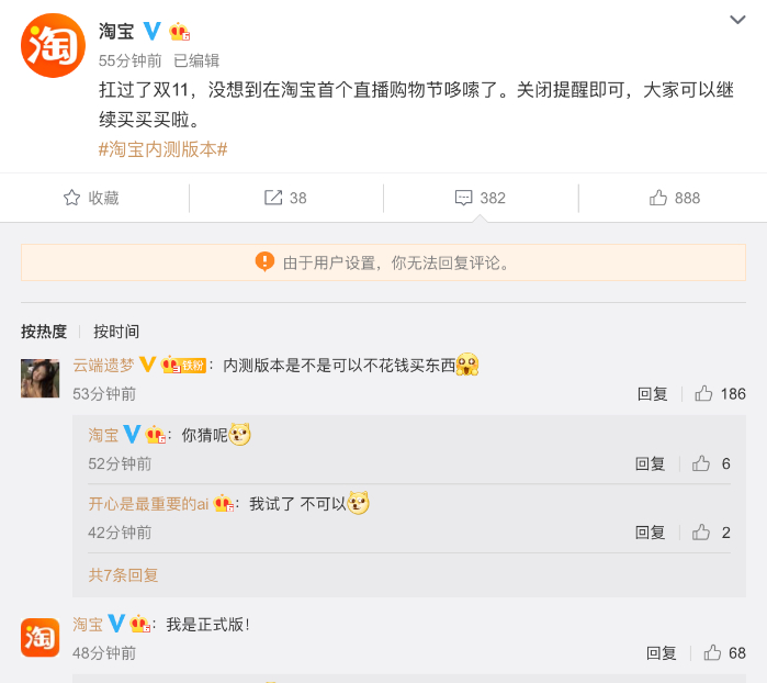 针对出现大量“淘宝内测版本”弹窗通知问题,淘宝官方微博刚刚回应称,“扛过了双11,没想到在淘宝首个直播购物节哆嗦了。关闭提醒即可。”而在评论区中,淘宝官博表示,“我是正式版”。