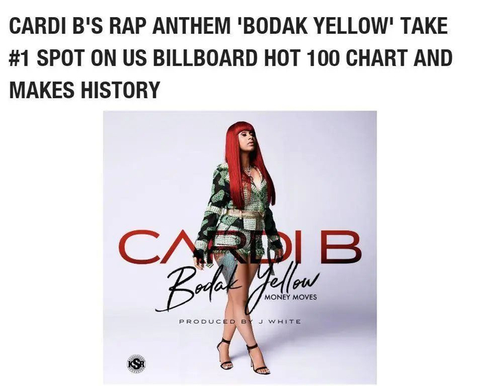 《Bodak Yellow》这只单曲甚至出道即冠,最终登顶了美国公告牌百强单曲榜(Billboard Hot 100),并蝉联了三周冠军。卡老师也成为19年以来第一位以solo身份拥有夺冠单曲且Billboard榜单历史上第五位登顶的女rapper。