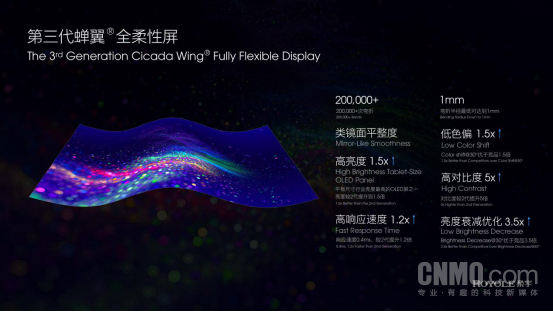 在显示性能方面,柔宇针对全柔性屏全新的显示形态,自定义新一代智能显示驱动芯片与电路设计;使得第三代蝉翼全柔性屏相较市面上的传统OLED屏在30°视角下色偏JNCD降低至0.6,亮度衰减优越1.5倍。