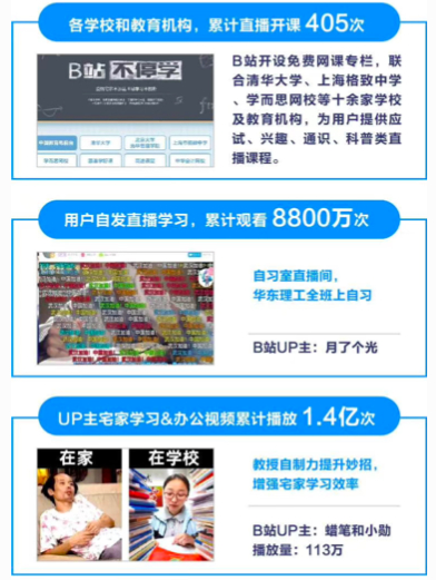 为了满足疫情期间年轻人在家学习的需求,2月5日,“B站不停学”页面正式上线,累计直播开课405次,涵盖了10余家学校及教育机构的课程内容,为用户提供了应试、兴趣、通识等直播课。