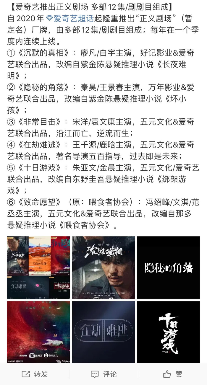 有消息称,爱奇艺会在Q2季度上线“正义剧场”,该剧场主打12集规格短悬疑剧,平台会在一个季度内对其进行集中释放,而《沉默的真相》将作为“正义剧场”的首发牌。该剧改编自紫金陈的高口碑小说《长夜难明》,属紫金陈“推理之王”系列第三部,第一部《无证之罪》已在2017年被爱奇艺影视化并播出,第二部《坏小孩》目前也被爱奇艺更名为《隐秘的角落》在进行影视化制作。