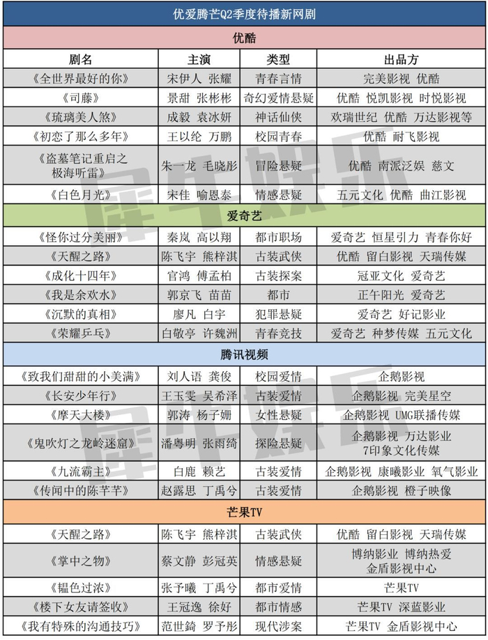 综合来看,优爱腾芒在Q2季度的剧集内容编排上更大手笔,诸如《致我们甜甜的小美满》《白色月光》《成化十四年》等各平台早前公布的头部重点项目均占比突出,且在打法上各有谋略。但究竟谁能拔得头筹,打响Q2季度网剧市场,最终还需要内容本身来验证。