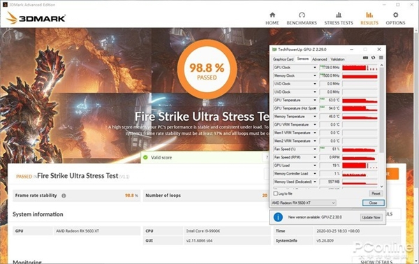 3DMark压力测试中97%的帧数通过视为及格,迪兰RX 5600 XT性能模式通过率为99.1%,静音模式为98.8%,说明显卡的稳定性非常优秀的。
