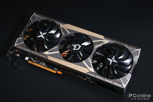 换角度看显卡,由于使用了和5700战神同款散热规格,所以显卡长度达到了32cm。但也换来了2个10cm和一个9cm风扇,还是值得的。