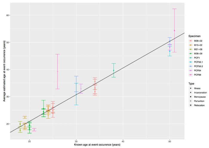 不难看出,同一个体的不同牙齿反映出的经历相关事件的年龄趋于一致,这也就是说,通过牙齿来判定个体的压力事件发生时间,是一种可靠的衡量方式。正如论文第一作者所说:
