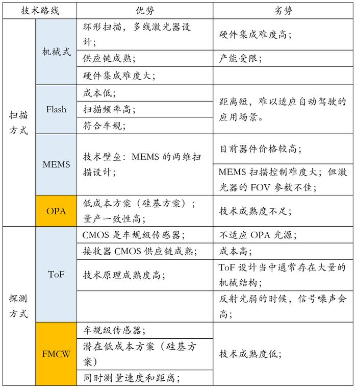 不管是哪种实现方式,激光雷达目前有一系列的问题需要解决:性能、可靠性、可量产性、成本等。各技术路线的优劣势对比如下: