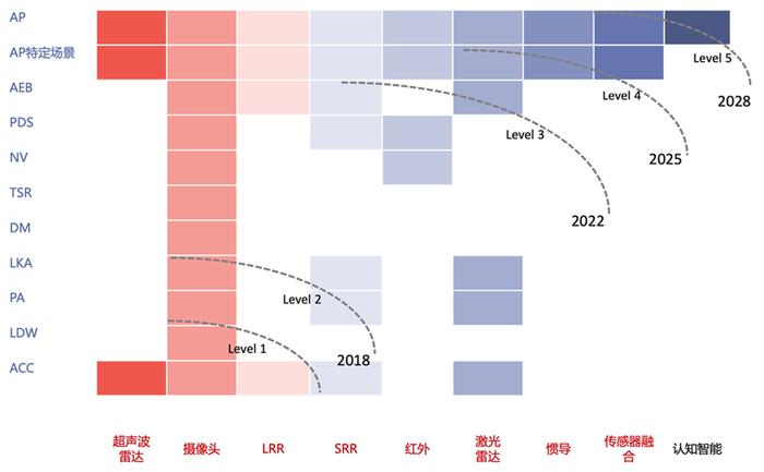 传感器在各级别自动驾驶的功能中的应用举例