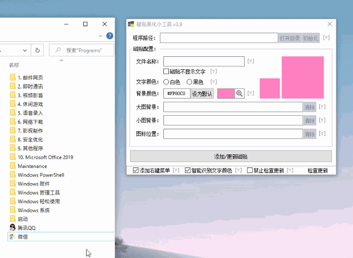 第三步. 将“微信”快捷方式直接拖到路径框内,点击“背景颜色”为磁贴换色。如果你之前没有配色基础,最好的办法就是直接使用软件主题色!除此之外,软件也为我们提供了一个快速读取桌面颜色的方法,拖拽旁边的“放大镜”,即可快速拾取目标位颜色;
