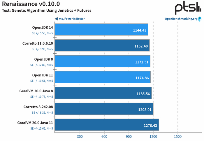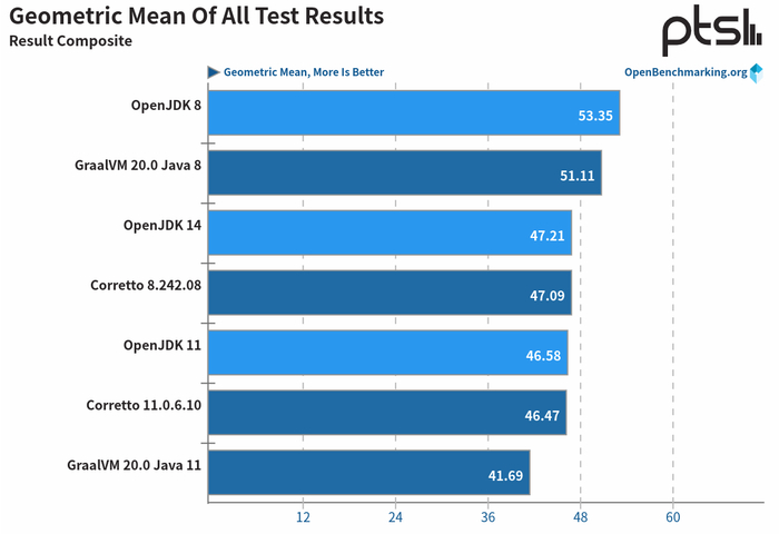 Phoronix 网站使用 Phoronix Test Suite 对比了在 OpenJDK 8/11、GraalVM 20 与 Amazon Corretto JVM 几个 JVM 平台中 Java 的基准性能。Phoronix Test Suite 是一个全面的测试和基准测试平台。可用于 Linux、Solaris、macOS、Windows 和 BSD 系统的测试,套件内包含多种维度的测试组件。