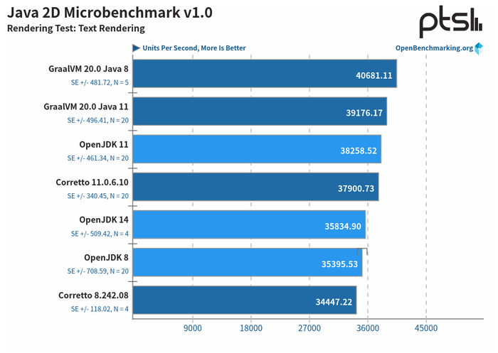 Java 2D 文本渲染测试中,GraalVM 20.0 性能最佳,尤其是 Java 8 构建版本,而 Corretto 的性能与 OpenJDK 8 和 11 相似。