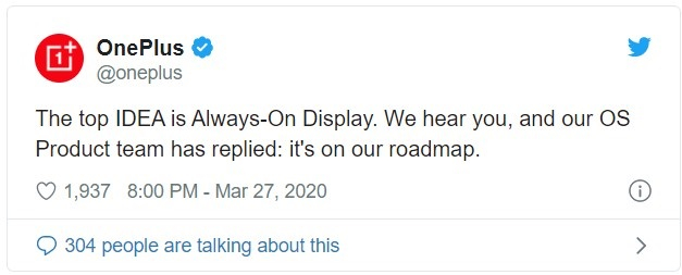 一加用户最终可能会获得他们一直在期待的功能-AOD 息屏常显,该公司在其官方社交网站上发布了一条推文,指出 TOP 级的“always-on display(AOD)”屏幕常显功能已确定提上系统开发日程。