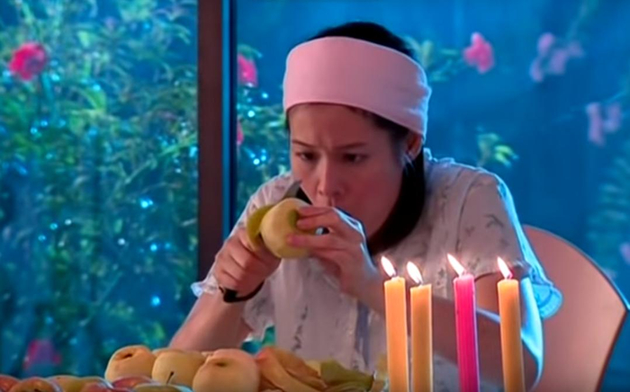 她会傻傻地相信在午夜12点的时候,拿着苹果,对着镜子削苹果,可以看见自己未来的老公。