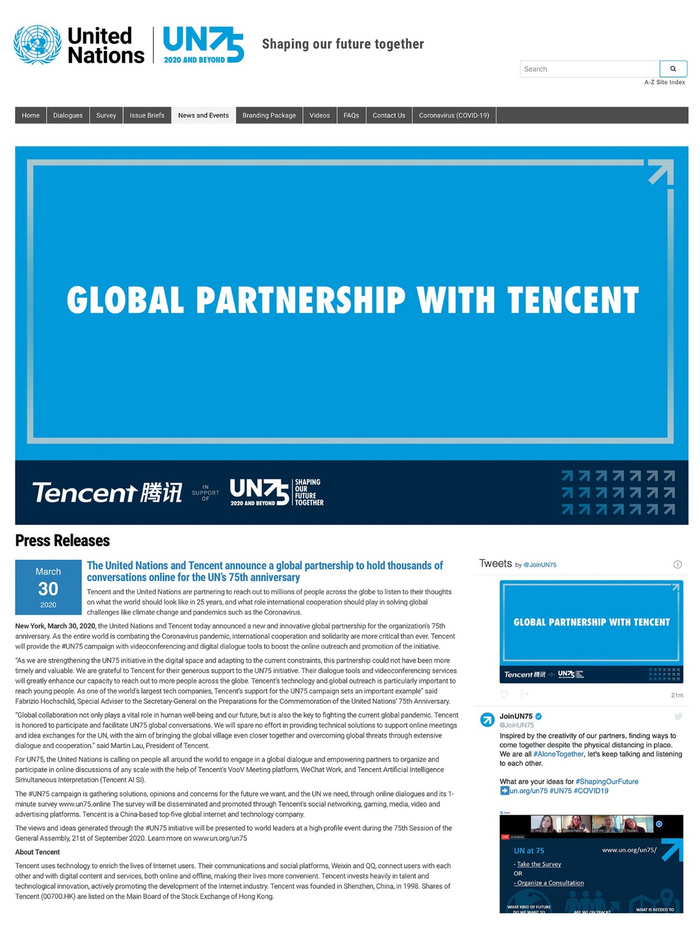 美东时间3月30日,联合国在纽约总部宣布,腾讯公司作为其全球合作伙伴,为联合国成立75周年提供全面技术方案,并将通过腾讯会议、企业微信和腾讯同传在线举办数千场会议活动。这意味着,在新冠病毒疫情之下,迄今为止规模最大的全球对话将在中国互联网科技企业的技术支持下进行。