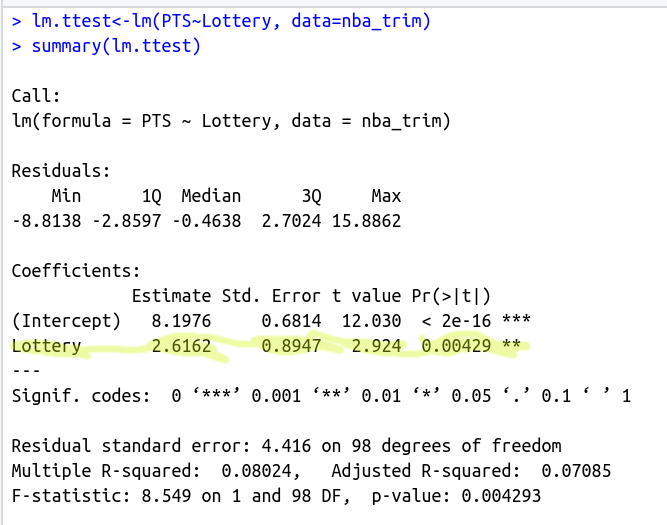 这告诉我们,乐透区选秀球员职业 PPG 减去非乐透区选秀球员的职业PPG,其平均值可能在3.48到4.78之间。这使我们对结果的趋势(正)和结果的大小(3.5-4.8点)都有一个了解。