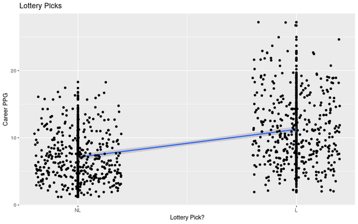 斜率项 β 反映了每场比赛中非乐透区选秀(x=0)和乐透区选秀(x=1)之间的平均分差异。这里的小幅上升趋势意味着,我们有证据表明乐透区选秀者在职业生涯中的平均分数往往更高。