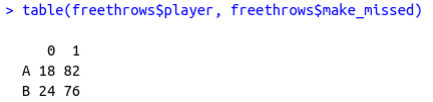 球员B的命中率仅为77%,而球员A的命中率则为80%,尽管这有抽样误差。可以使用R语言中的table命令查看随机绘制的结果: